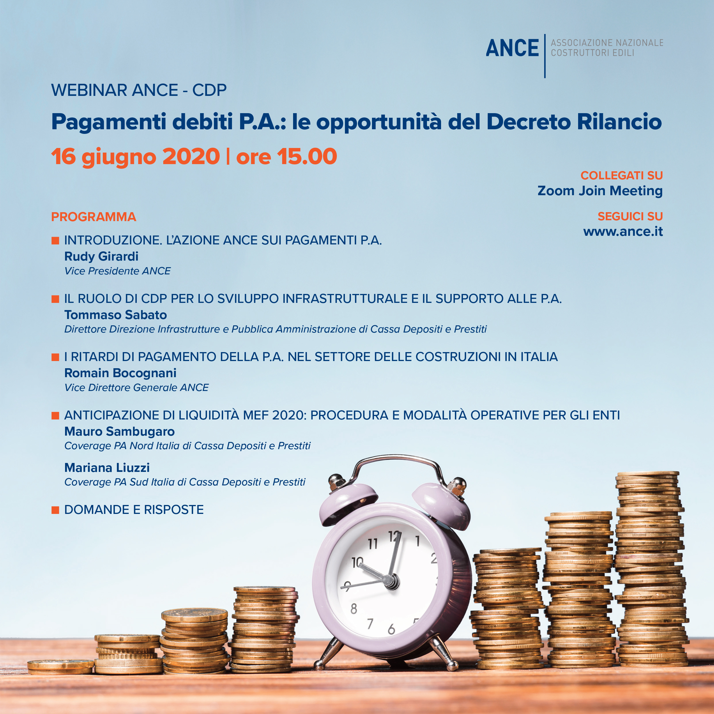 Per dare la massima diffusione alle modalità attuative dell’anticipazione di liquidità, prevista dal DL Rilancio, che consentirà agli enti territoriali di pagare debiti arretrati per 12 miliardi di euro, l’Ance ha organizzato, martedì 16 giugno alle ore 15.00, un webinar, al quale interverrà Cassa Depositi e Prestiti